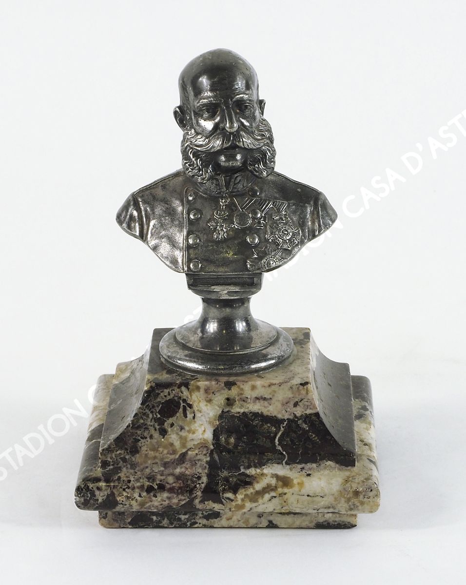 Scultura in argento raffigurante busto di Francesco Giuseppe, su base in marmo. H. tot cm. 17,5.