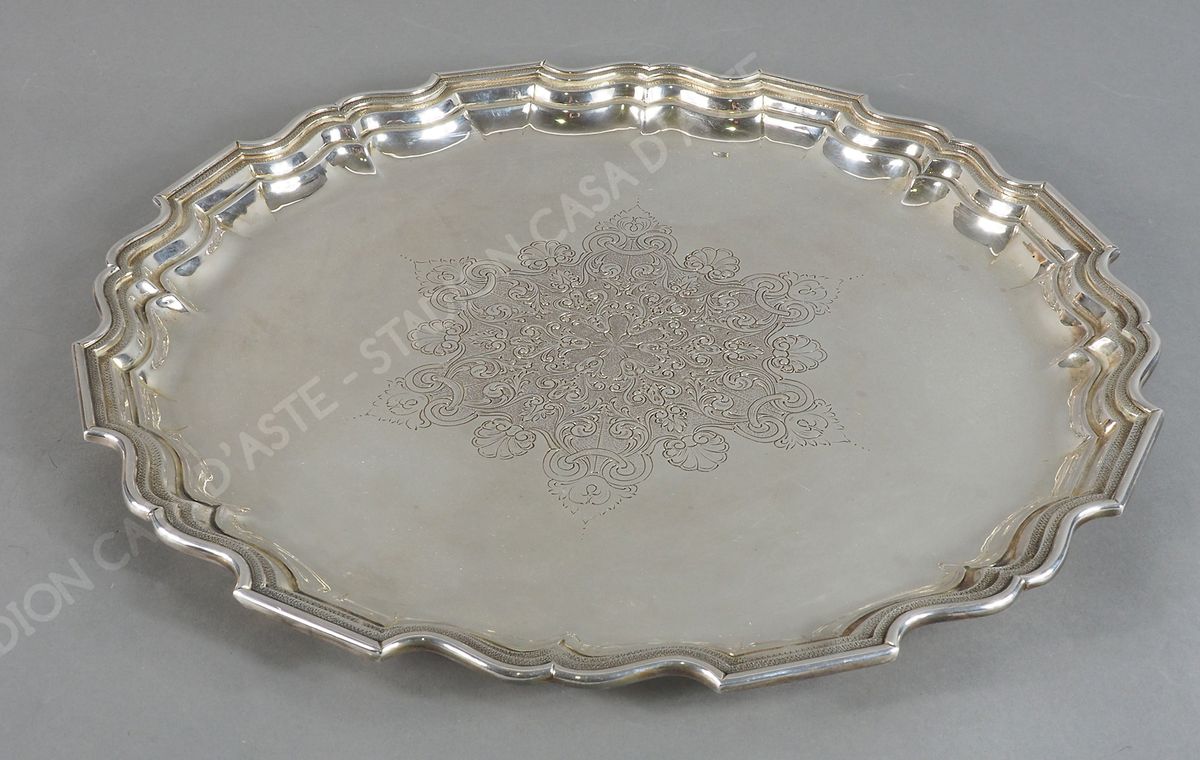 Grande vassoio in argneto con bordo sagomato, al centro incisione a motivi vegetali. Diam. cm. 45. gr. 1800.