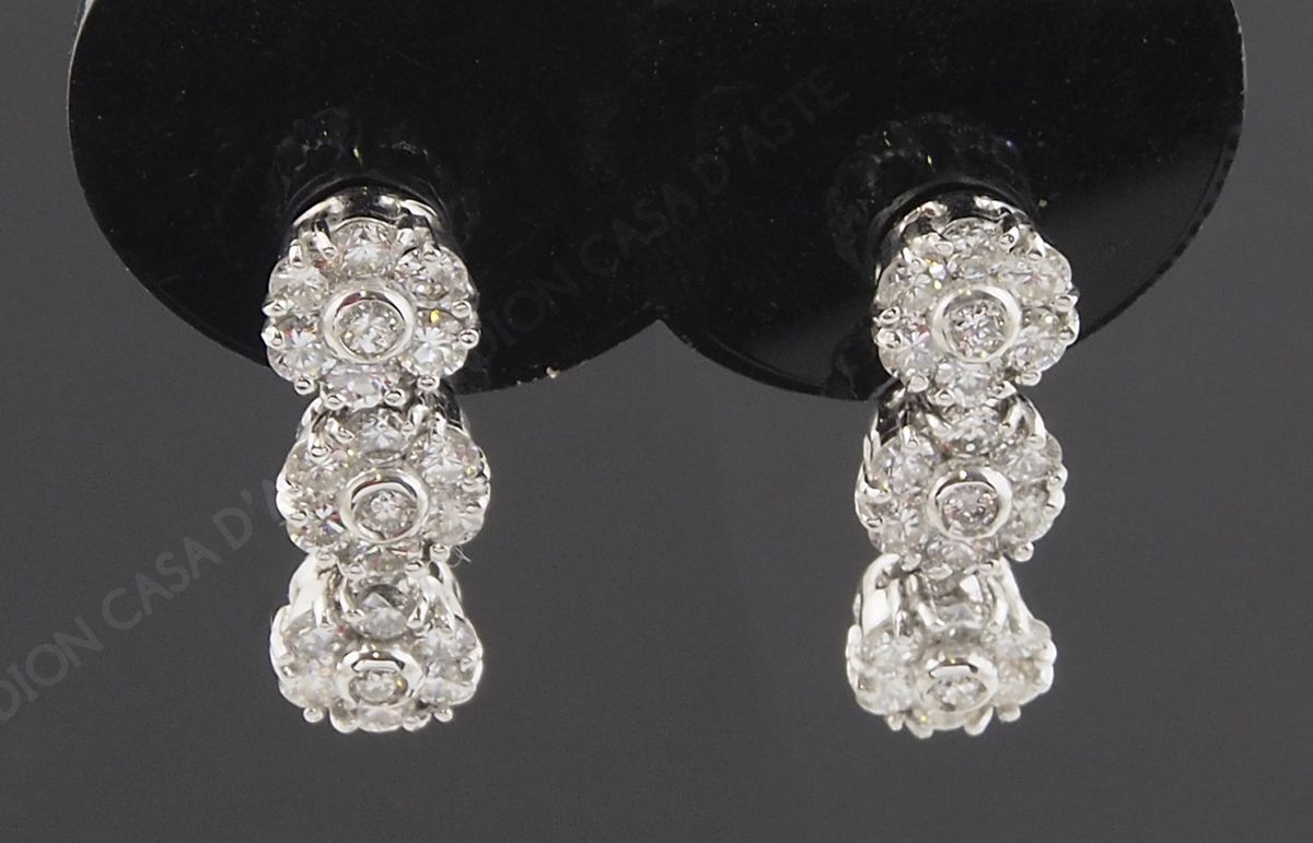 Lotto 617 | Orecchini in oro bianco con discesa di 3 fiorellini oscillanti ricoperti da...