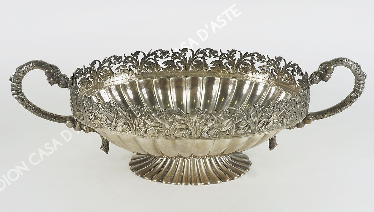 Centrotavola di forma ovale in argento lavorato a coste verticali con bordo traforato con figure di uccelli. cm. 49x24. gr. 1120.