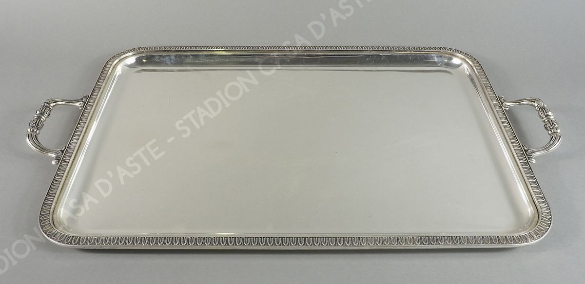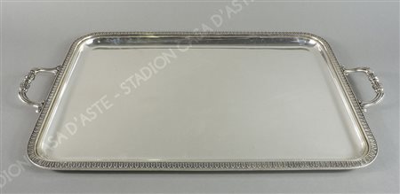 Grande vassoio rettangolare in argento con bordo lavorato a palmette e manici...