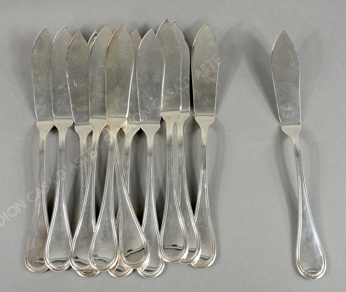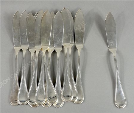 Lotto di 12 coltelli da pesce in argento. gr. 690.