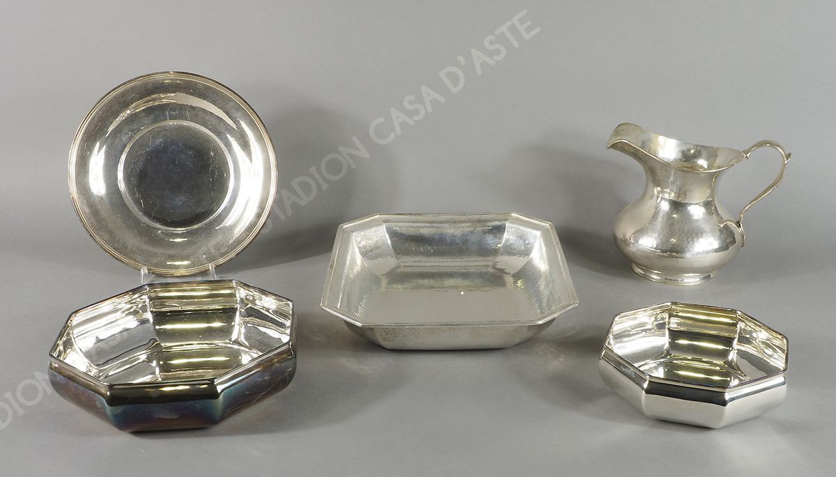 Lotto di vari oggetti in argento tra cui brocca e contenitori. gr. 2100.