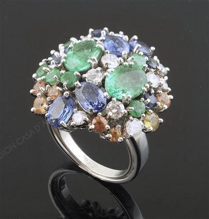Anello in oro bianco "tutti frutti" con diamanti, smerladi e zaffiri. Misure...