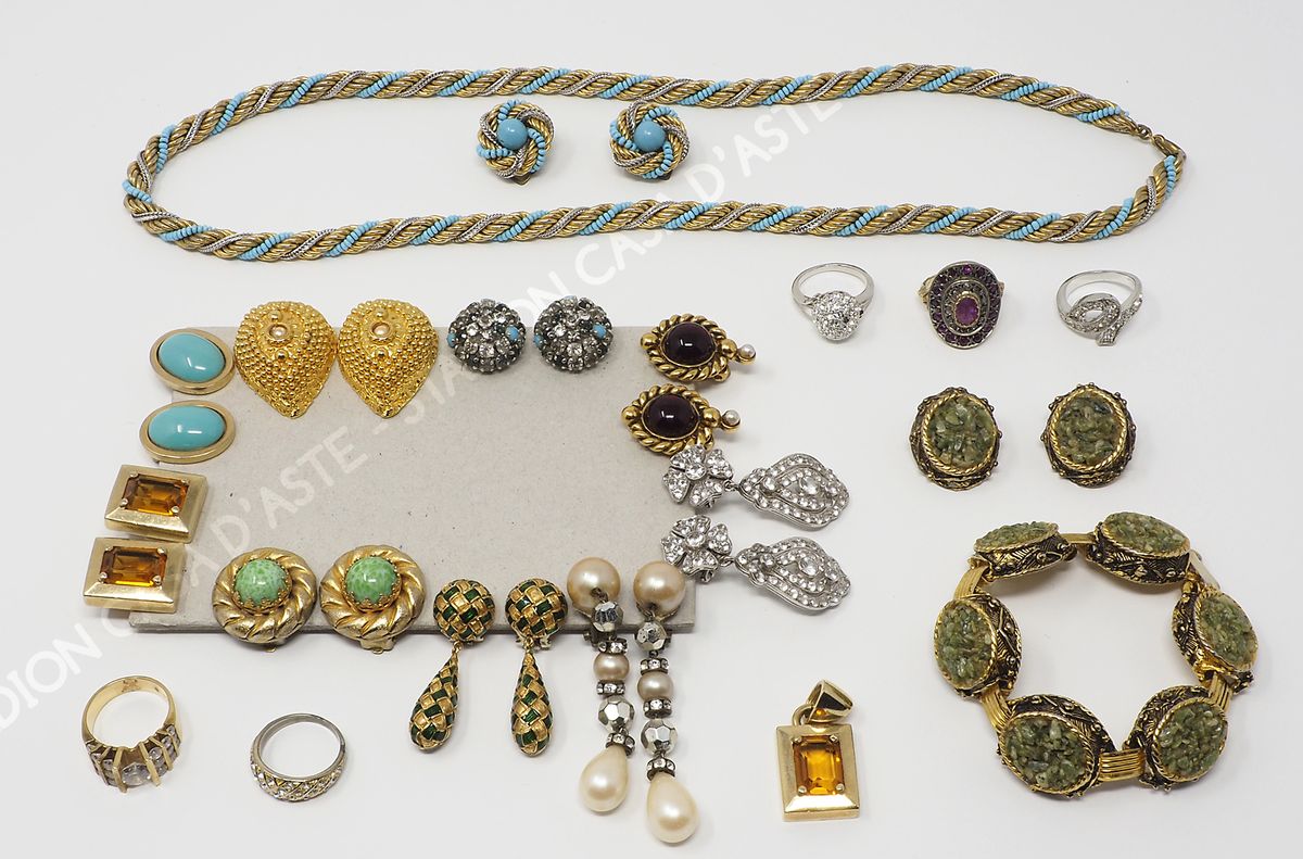 Lotto di bigiotteria composto da orecchini clip, anelli e collana