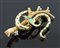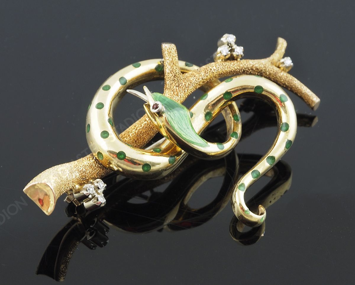 Spilla in oro giallo e rosa satinato raffigurante serpente su ramo con diamantini e smalti verdi, gr 16