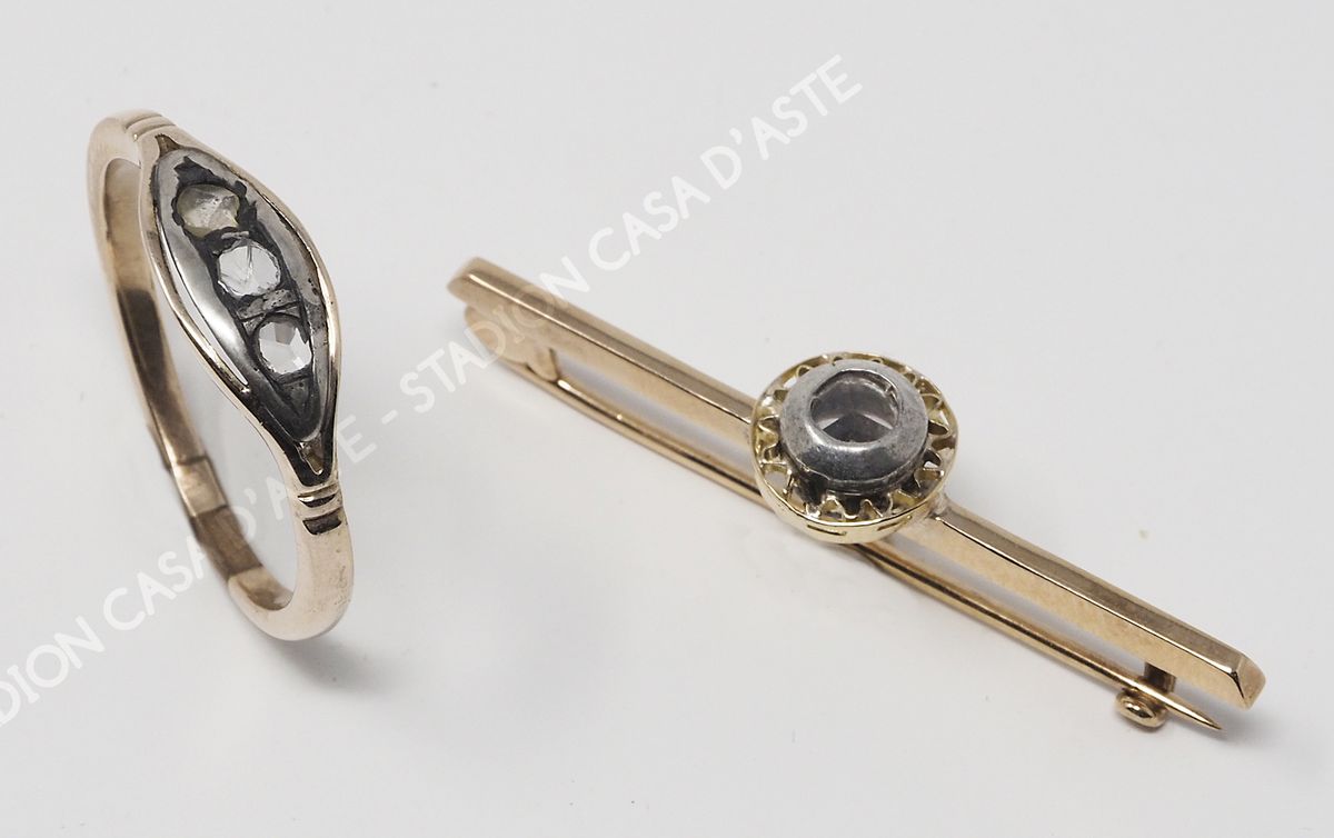 Lotto composto da anello e piccola spilla a barretta. Primi '900.