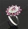 Anello in oro bianco a forma di fiore con diamantini e rubini. Misura 17