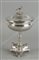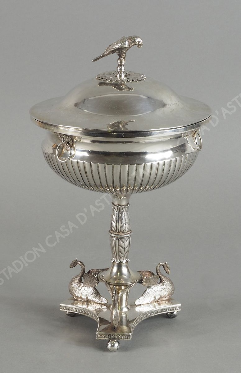 Zuccheriera in argento con alla base tre cigni che sorreggono in contenitore lavorato a coste verticali, ai lati teste leonine, sul coperchio una figura di pappagallo. Svezia, metà XIX secolo. H. cm. 29. gr. 900.