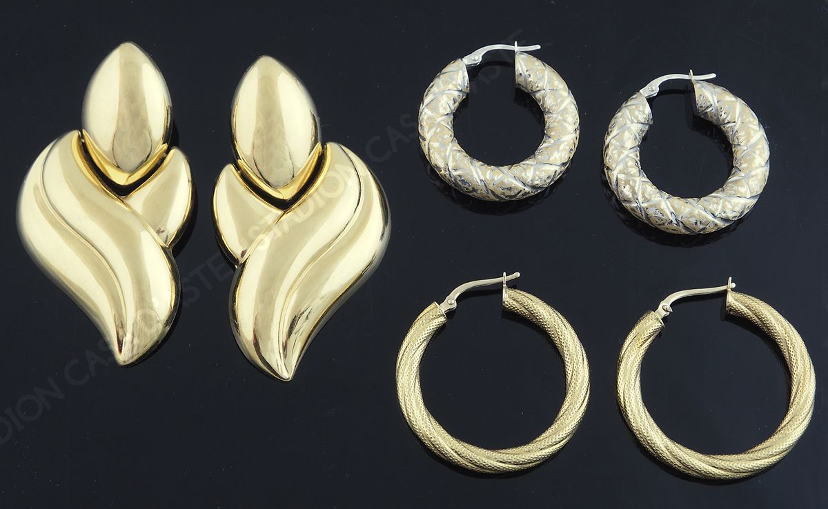Lotto composto da 3 paia di orecchini in oro giallo, due a cerchio, uno pendenti forma di foglia, tot gr. 23,6