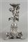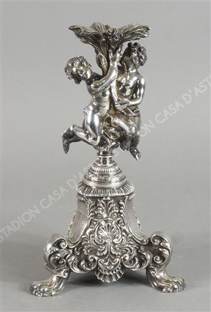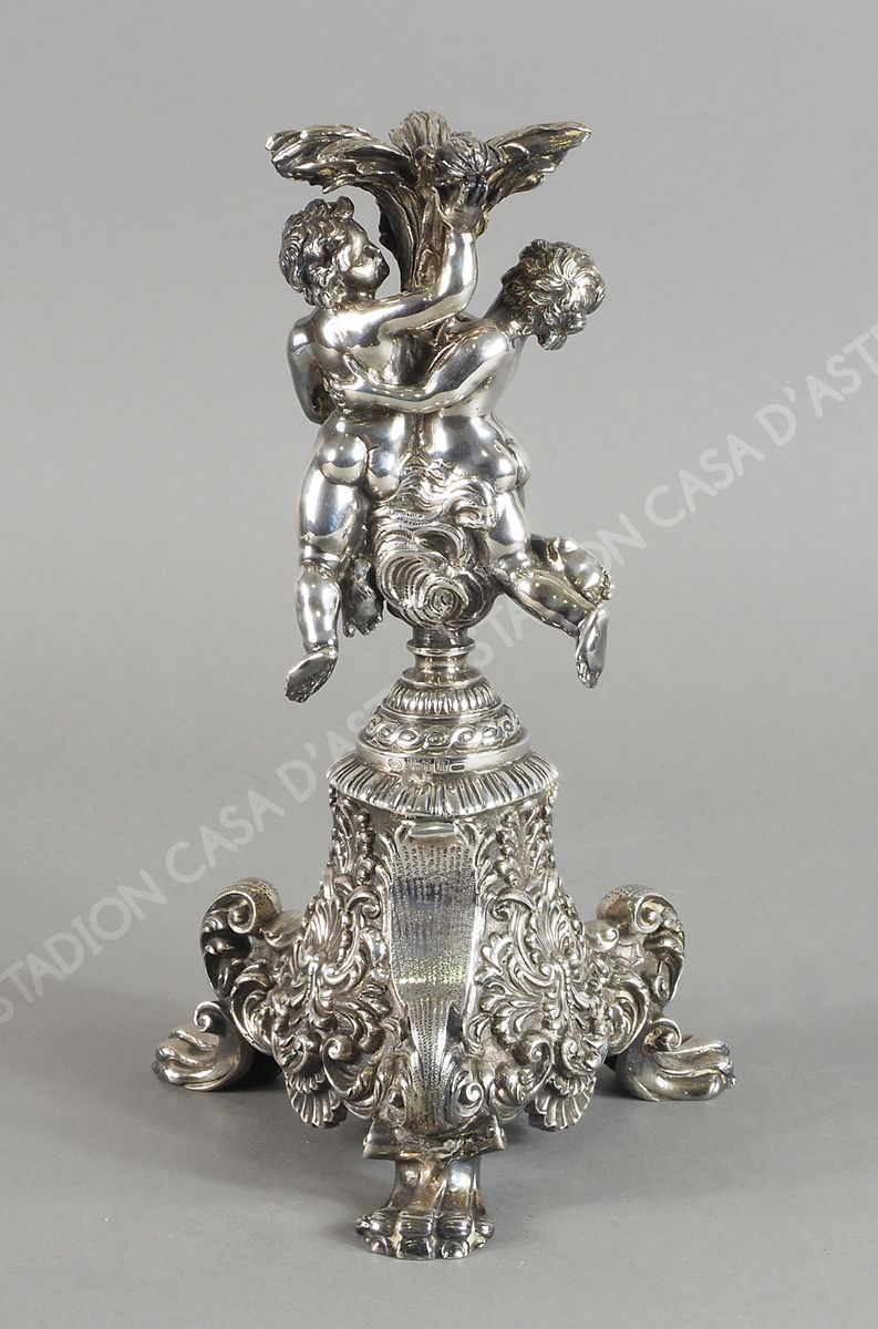 Base in argento riccamente sbalzata a motivi floreali e due figure di putti, su tre zampe ferine. Punzone Nardi Venezia, XX secolo. H. cm. 27. gr. 1750.