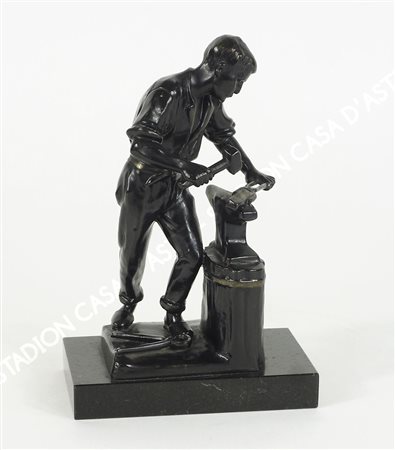 Scultura in bronzo a patina scura raffigurante fabbro, su base in marmo nero....
