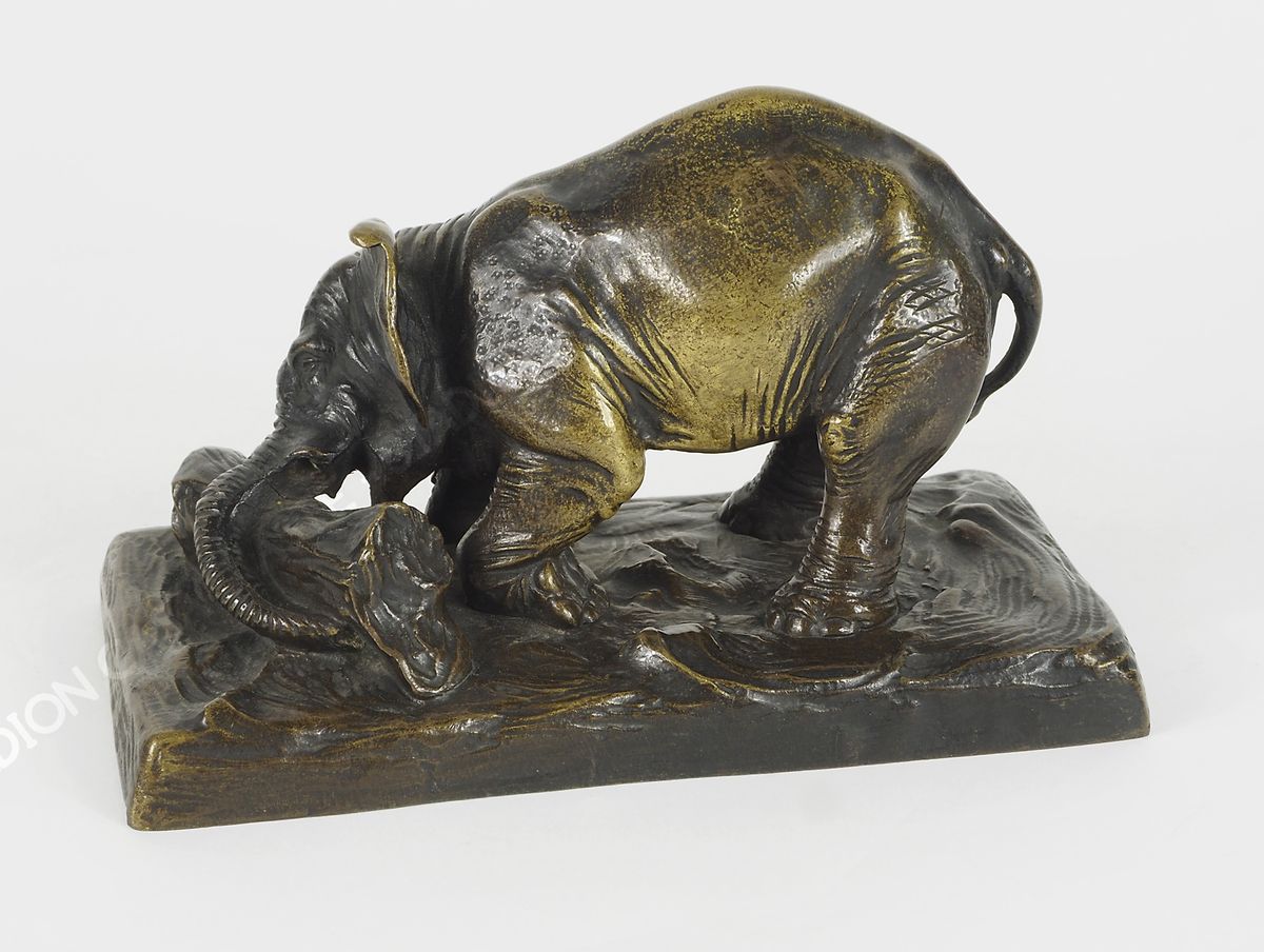 A. Titze Scultura in bronzo a patina marrone raffigurante elefante. Lung. cm....