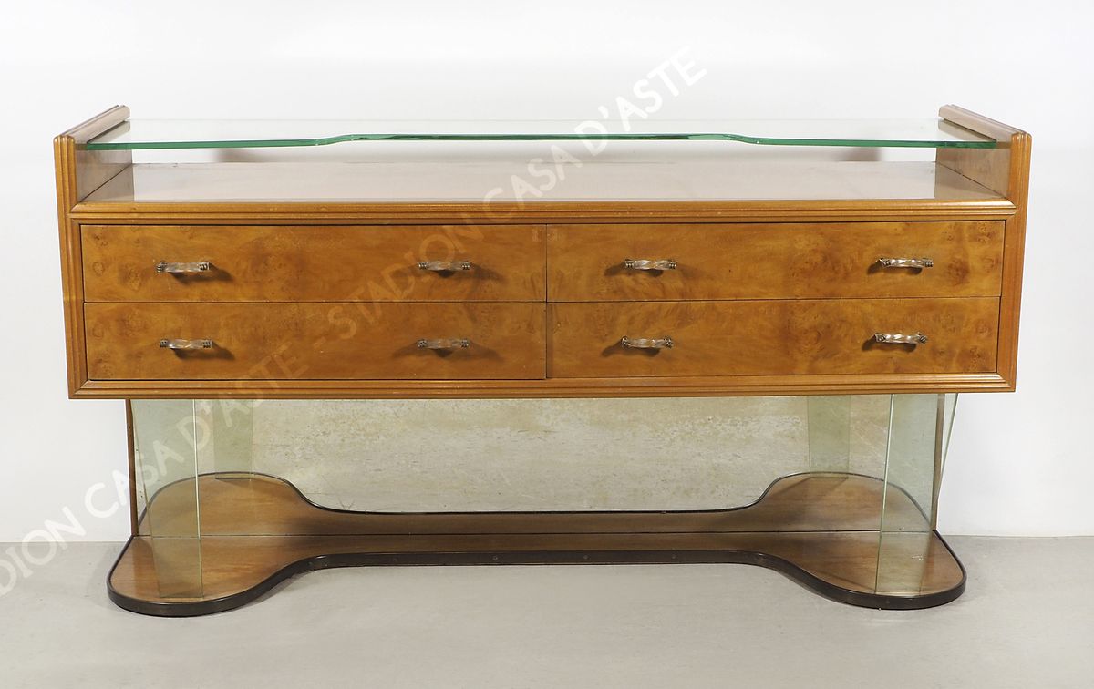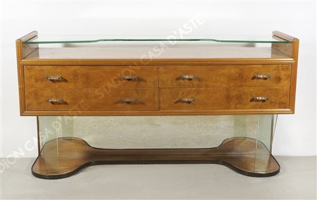 Lotto 812 | Credenza a 4 cassetti in legno chiaro con ripiano e gambe anteriori in vetro....