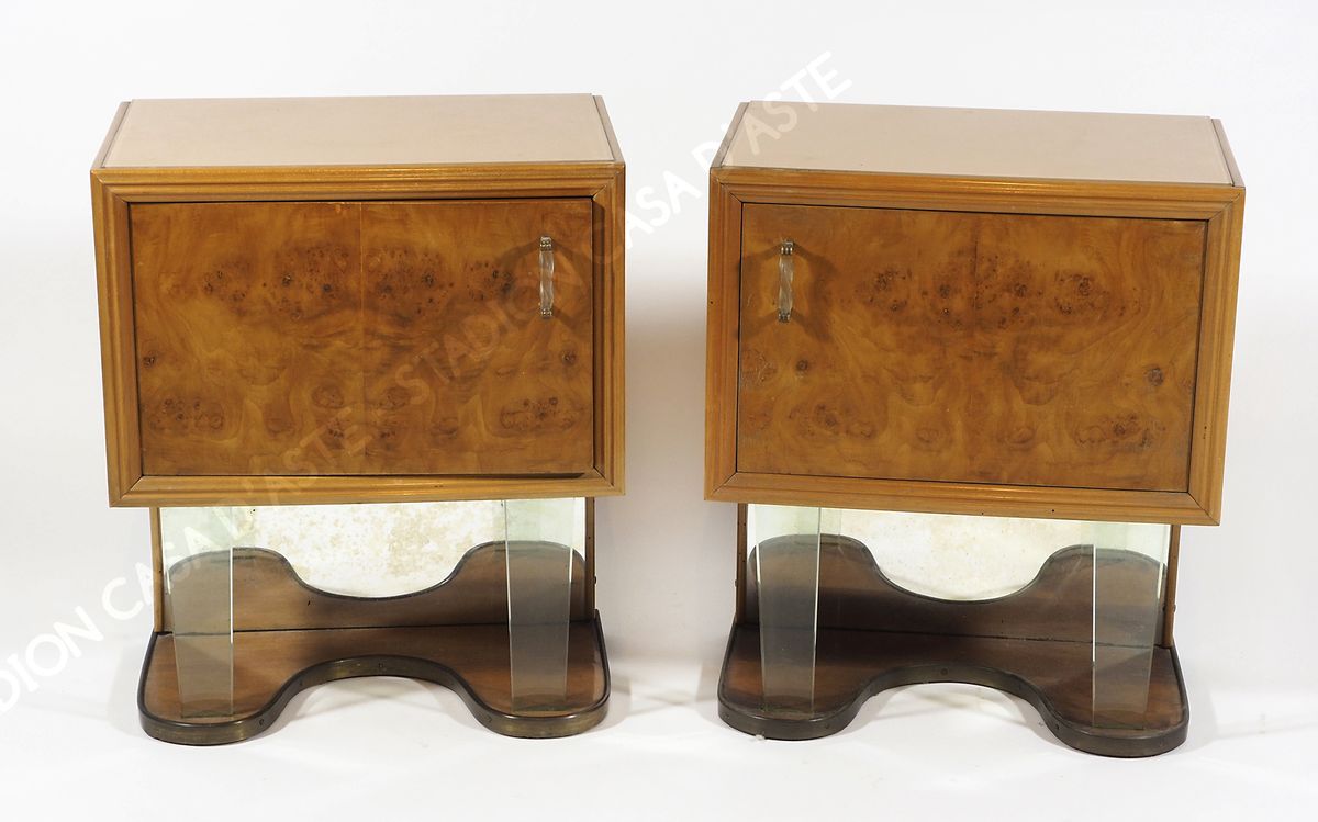 Lotto 813 | Coppia di comodini con anta in legno chiaro con gambe anteriori in vetro....