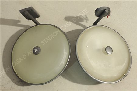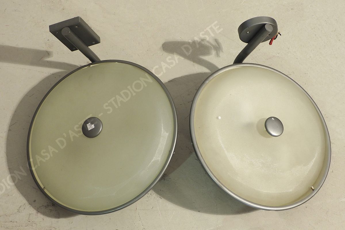 Stilnovo: paio di appliques in metallo laccato grigio e vetro. Etichetta originale all'interno. Diam. cm. 38.