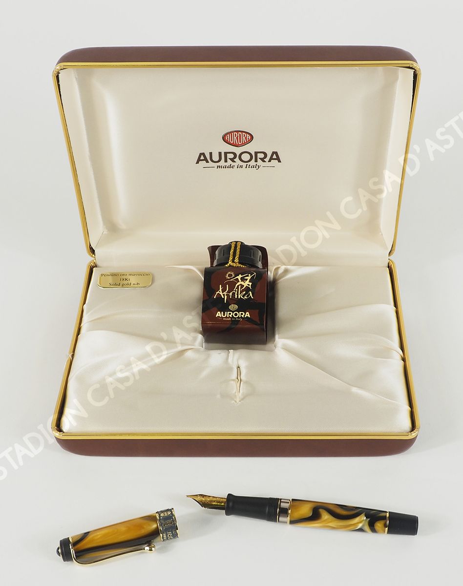 Aurora: penna stilografica modello Afrika con pennino in oro giallo, entro astuccio originale.