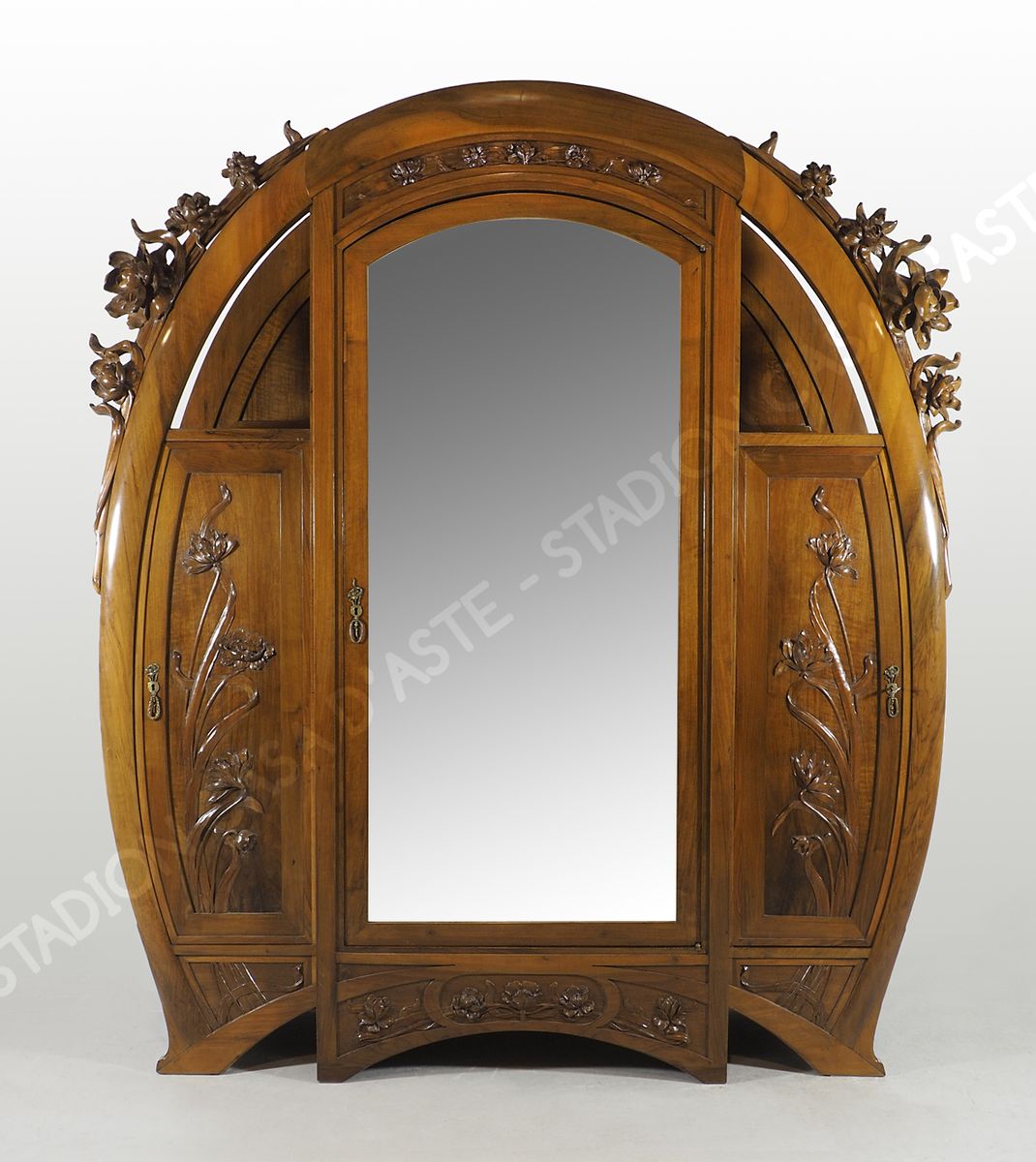 Armadio in legno con anta centrale a specchio e due ante laterali, applicazioni di fregi a motivi floreali. Epoca Liberty. cm. 225x195x57.