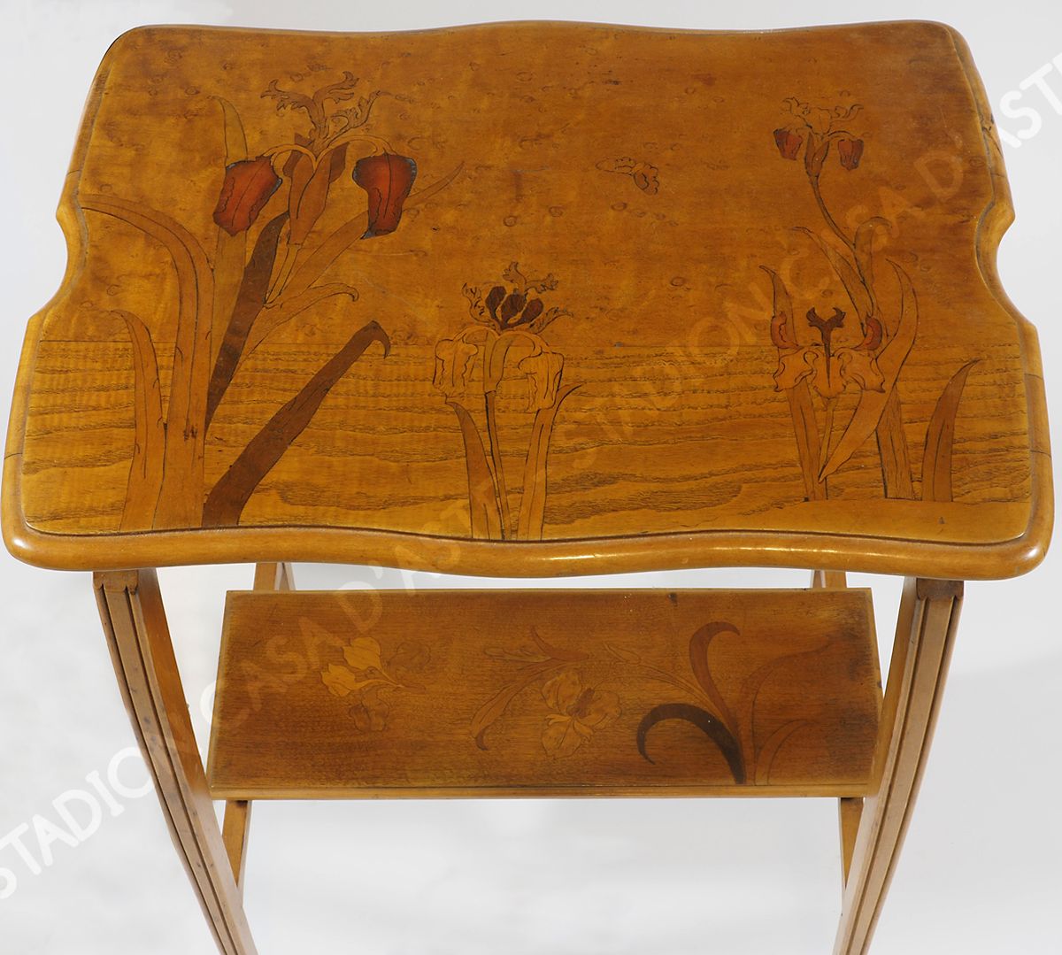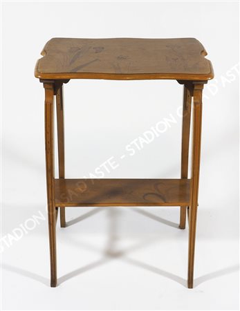 Tavolino in legno chiaro con piano finemente intarsiato in legni chiari a motivi floreali, su alte gambe mosse. Epoca Liberty. cm. 75x53x38.