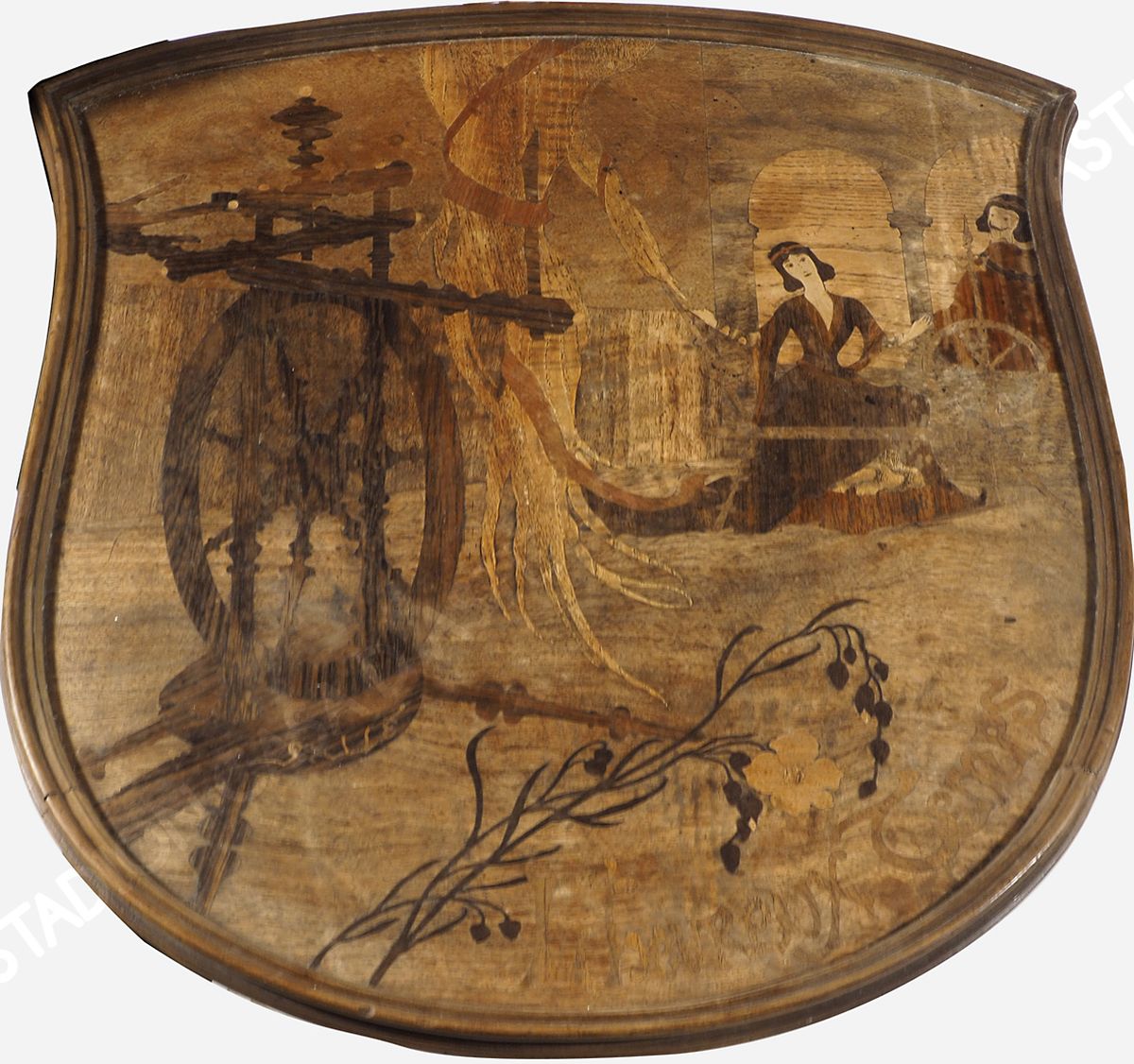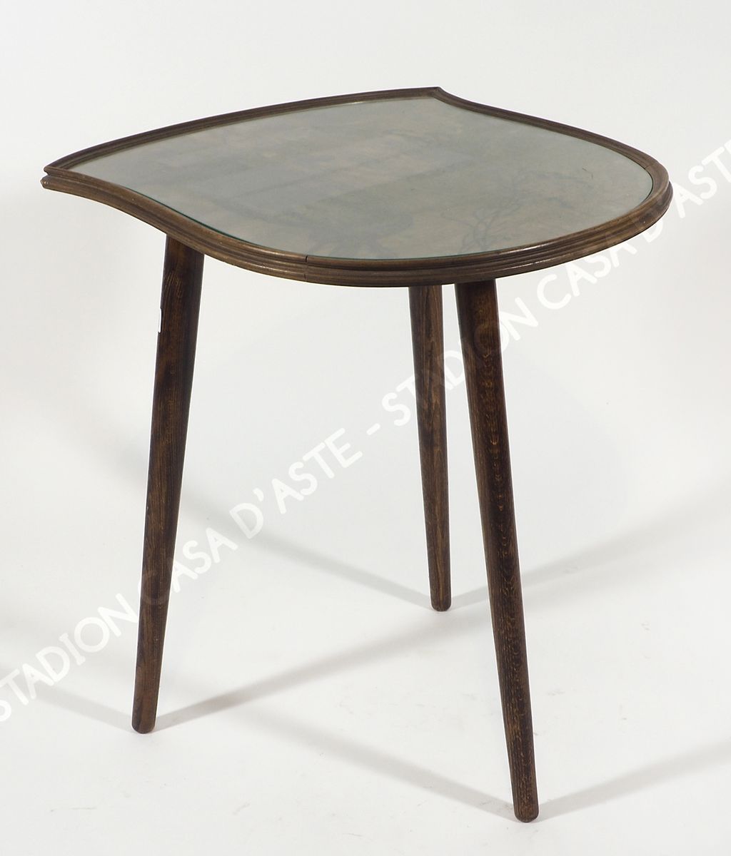 Lotto 884 | Tavolo con piano sagomato e intarsiato riaffguranti personaggi e rami...
