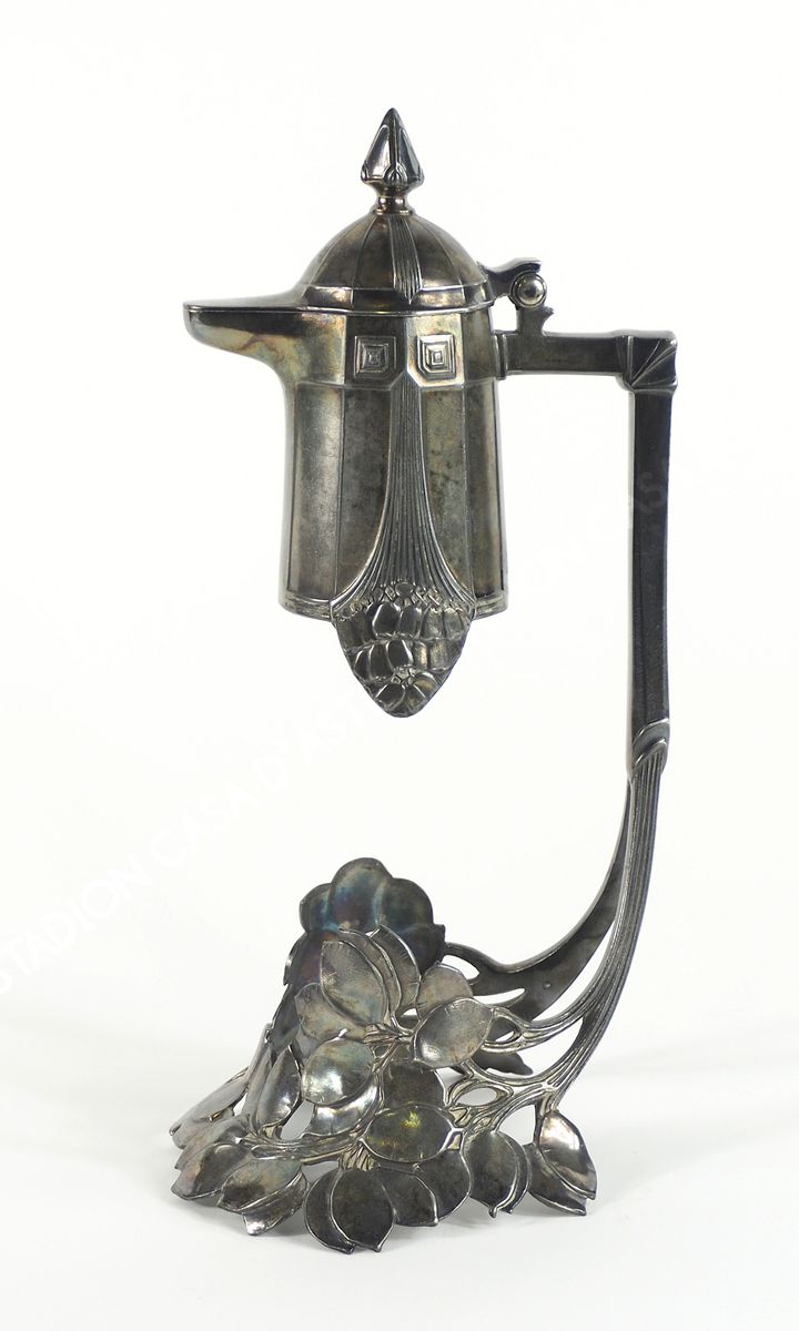 Montatura di brocca in peltro con decorazioni floreali. Epoca Liberty. H. cm....