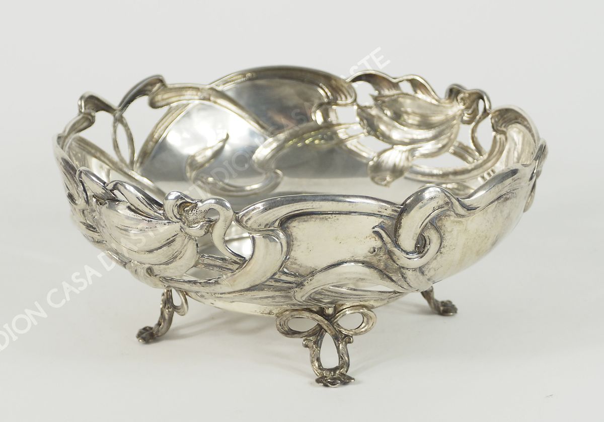 Fruttiera in argento con bordo rialzato e traforato decorato a motivi floreali. Epoca Liberty. Diam. cm. 19. gr. 280.