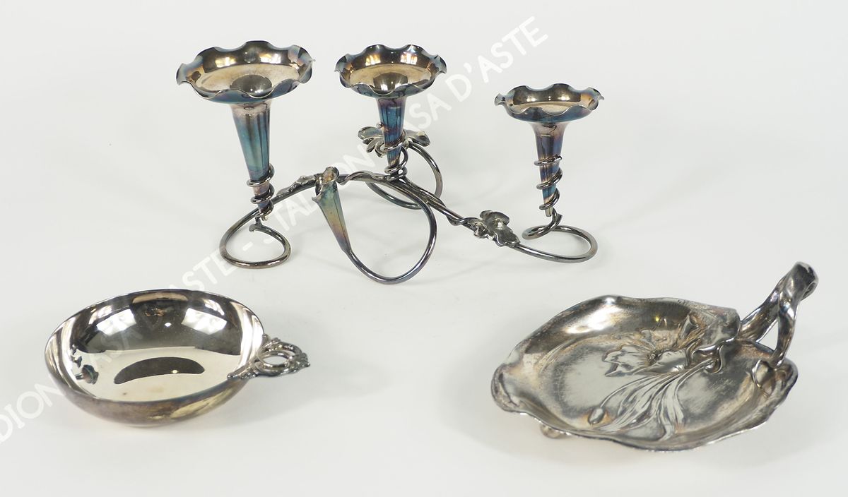 Lotto di 3 oggetti in metallo tra cui portacandele e contentitore. Epoca Liberty.
