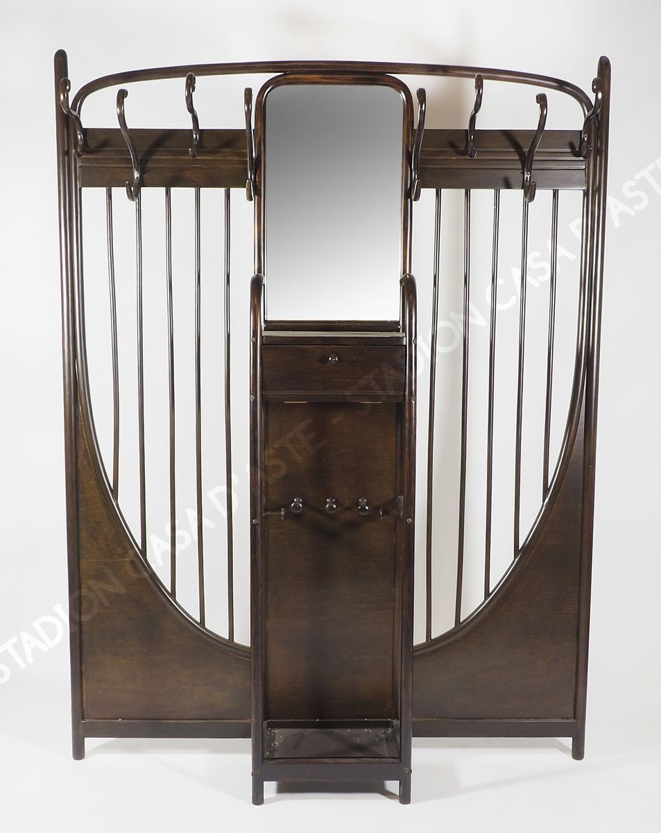 Attaccapanni da parete in legno con cassetto centrale e portaombrelli. Al retro etichetta originale. Austria, inizio XX secolo. cm. 196x146x32.