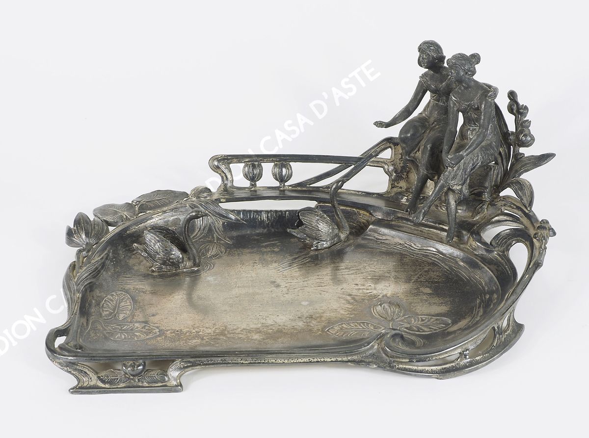 Centrotavola in peltro lavorato con foglie e figure di cigni a rilievo, sul bordo due figure femminili. Epoca Liberty. cm. 25x39.