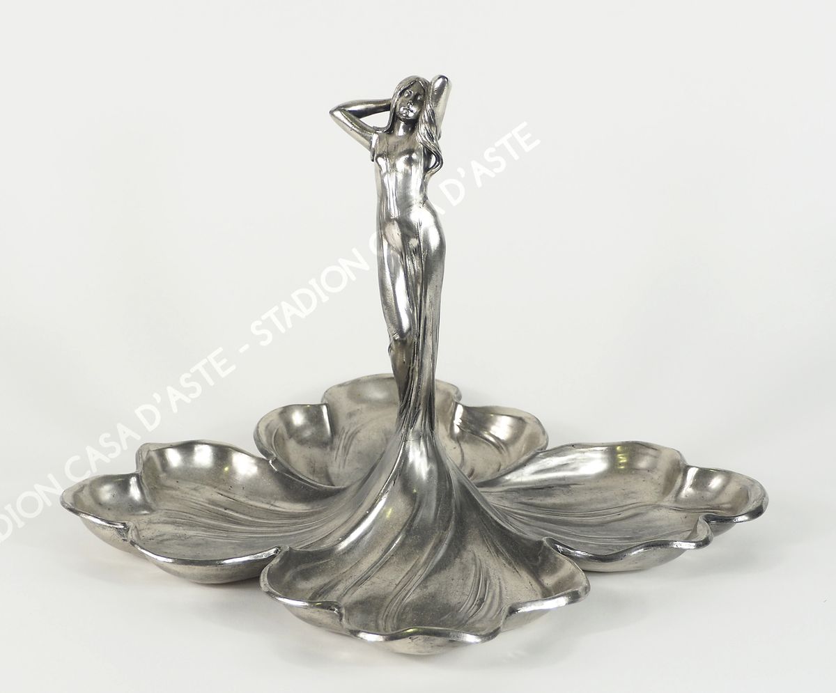 Centrotavola in peltro lavorato con 4 conchiglie e figura di donna al centro. Epoca Liberty. H. cm. 27.