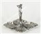 Centrotavola in peltro lavorato con 4 conchiglie e figura di donna al centro....