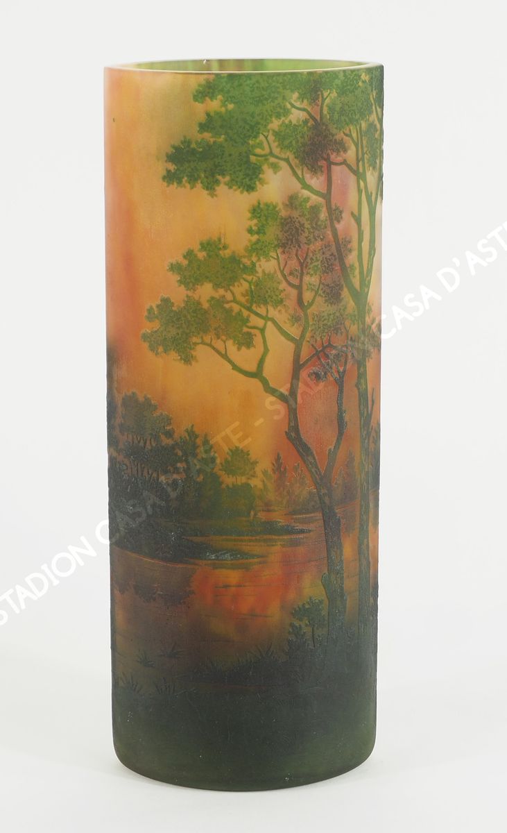 Daum: vaso in vetro di forma ovale nei toni dell'arancio e verde raffigurante bosco. Firmato Daum Nancy. H. cm. 30.