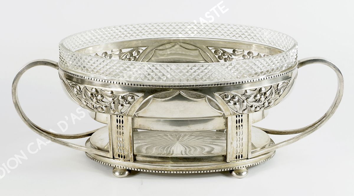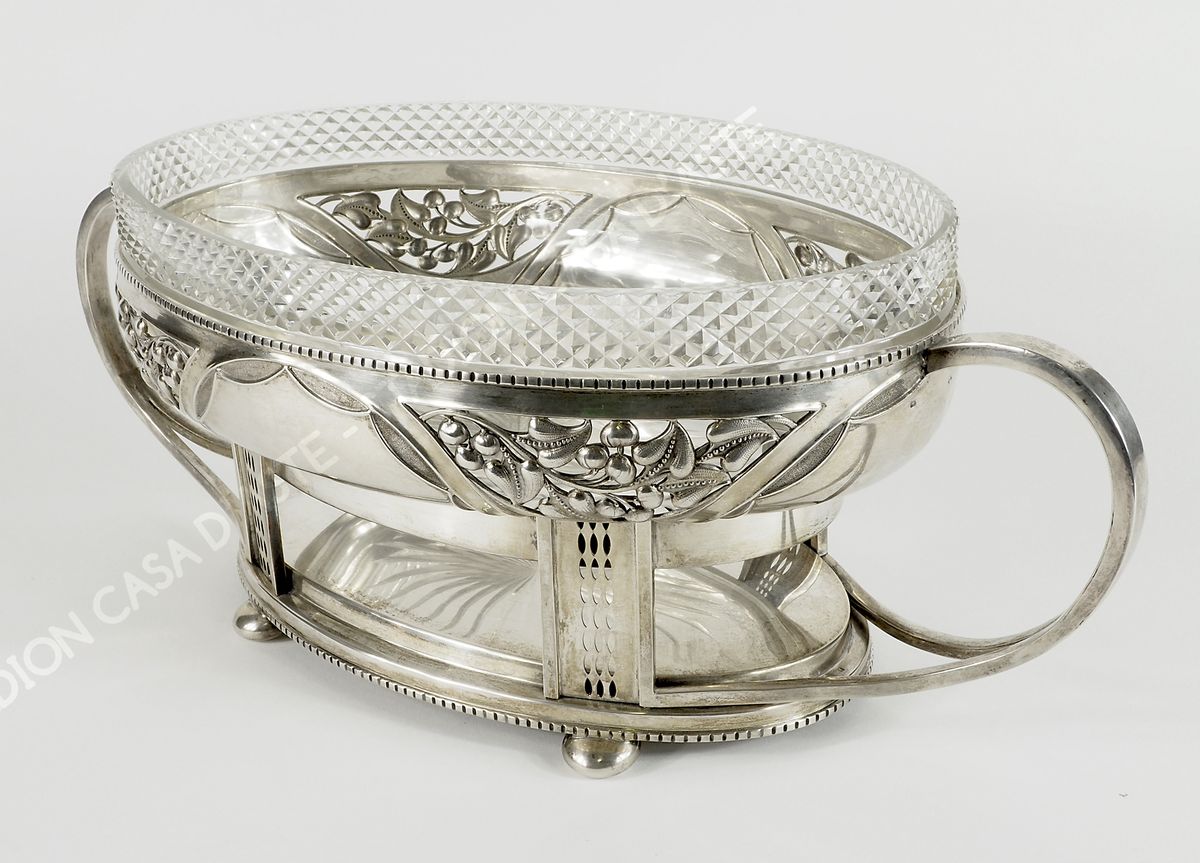 Centrotavola di forma ovale in argento traforato a motivi floreali e due grandi manici laterali, interno in vetro. Punzone Austria, inizio XX secolo. Eduard Friedmann(?). cm. 46x22. gr. 1260.