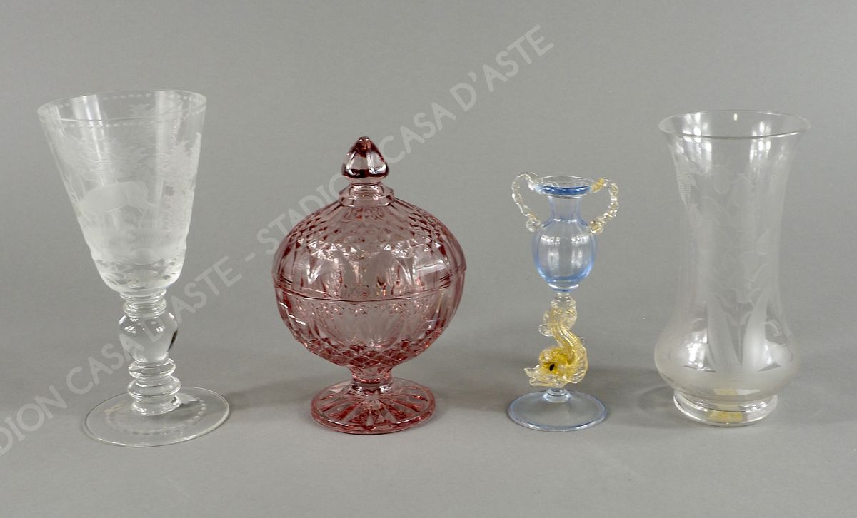 Lotto di 4 oggetti in vetro trasparente tra cui coppa con coperchio e calice. H. max cm. 18,5. Inizio XX secolo.