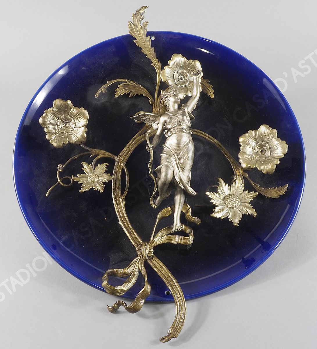 Piatto in ceramica blu con applicazioni in metallo raffiguranti figure femminile. Diam. cm. 43.