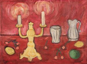 Enrico Baj Milano 1924 - Vergiate (Va) 2003 Natura morta, 1947 Olio su tela, cm. 44,5x59,8 Firma in basso a sinistra: Baj; al verso sulla tela: Baj / 1947. Bibliografia: Roberta Cerini, Martina Corgnati, Enri- co Baj. Catalogo generale delle opere dal 1972 al 1996, Ediz. Marconi-Menhir, 1997, p. 470, n. 12.A.
