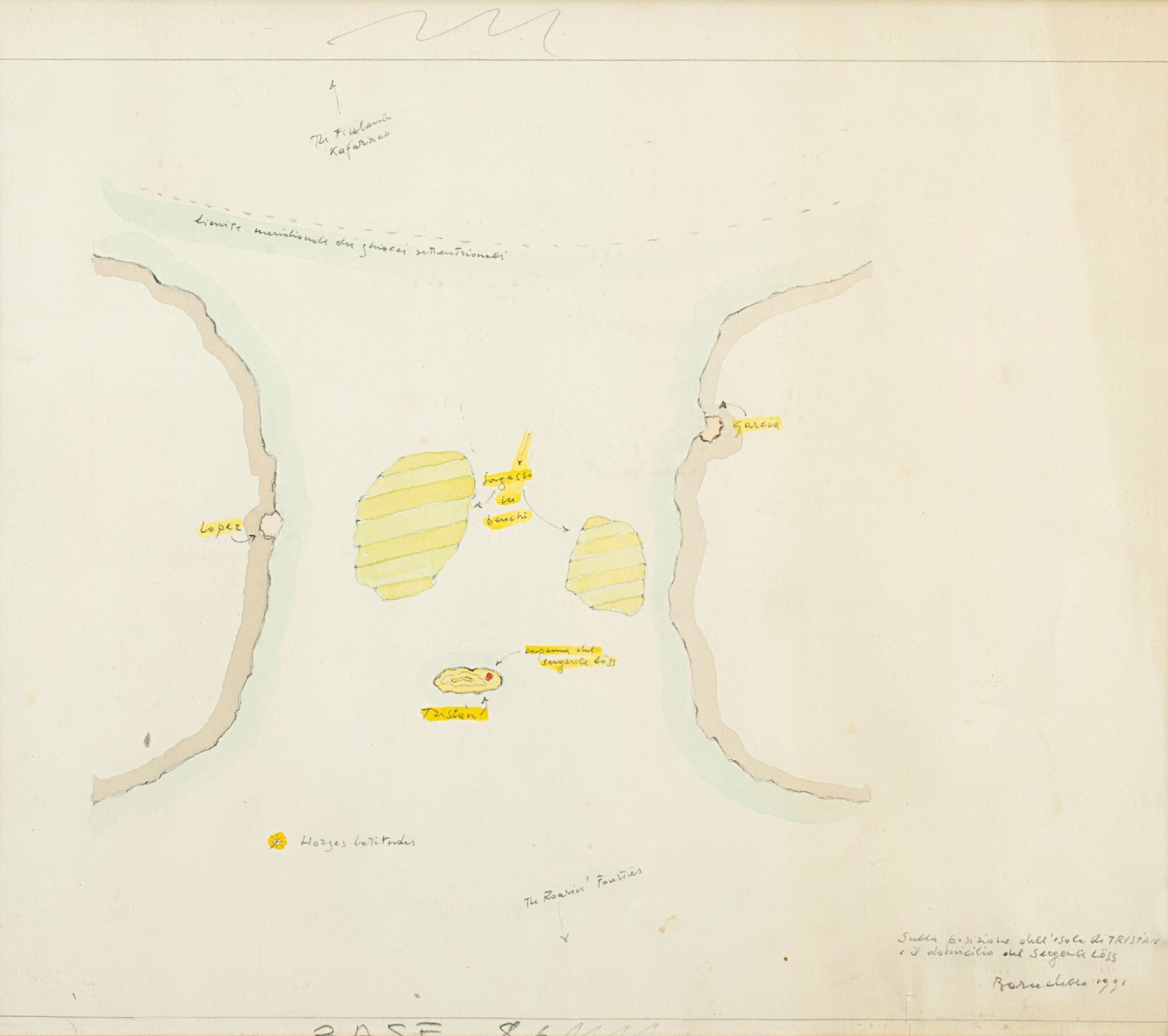 Titolato, firmato e datato in basso a destra: Sulla posizione dell'isola di Tristan e il domicilio del sergente Loss, Baruchello 1991