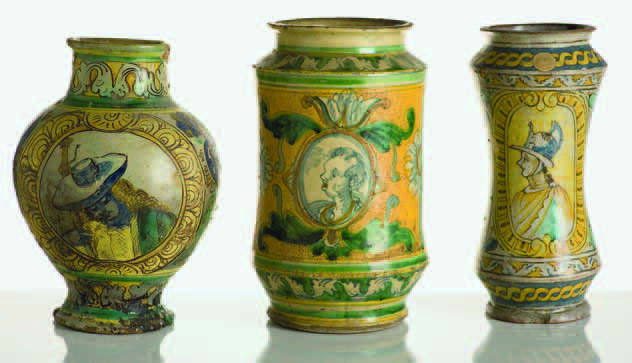 Bombola ovoidale in maiolica policroma, Burgio o Sciacca, XVII secolo, centrata da un medaglione figurato e tralci vegetali con corolle fiorite al verso. Altezza cm 30; restauri e una lieve mancanza
