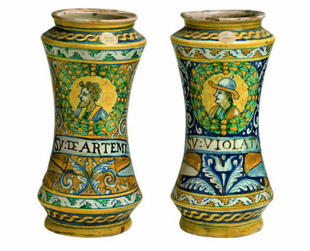 Due albarelli in maiolica policroma, Palermo, Andrea Pantaleo, inizi del XVII secolo, decorati “a quartieri”, con medaglioni figurati sul fronte e sul retro, ciascuno con cartiglio iscritto: “Sy: De Artemi” e “Sy: Violatv”. Altezza cm 29; uno con restauri Un esemplare simile è pubblicato in R. Daidone, La ceramica siciliana, Palermo, 2005, n.82; in cui viene rimarcata la peculiarità del motivo “a quartieri”, circoscritta all’attività iniziale del decoratore monrealese presso l’officina dei fratelli nasitani fino alla chiusura nel 1607, mentre l’influenza dell’ornamentazione “a trofei” è attinta dal successivo trasferimento di Pantaleo nell’officina Oliva, al seguito di Paolo Lazzaro che ne è l’animatore.