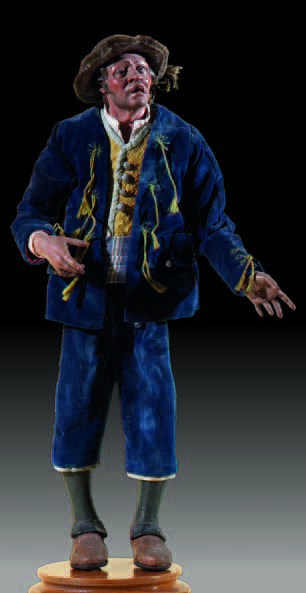Giovane borghese vestito con abito di colore blu, panciotto giallo e fascia a righe in vita. Accessorio: un cappello Altezza cm 37 Attribuito per tradizione a Francesco Celebrano, Napoli, fine del XVIII secolo