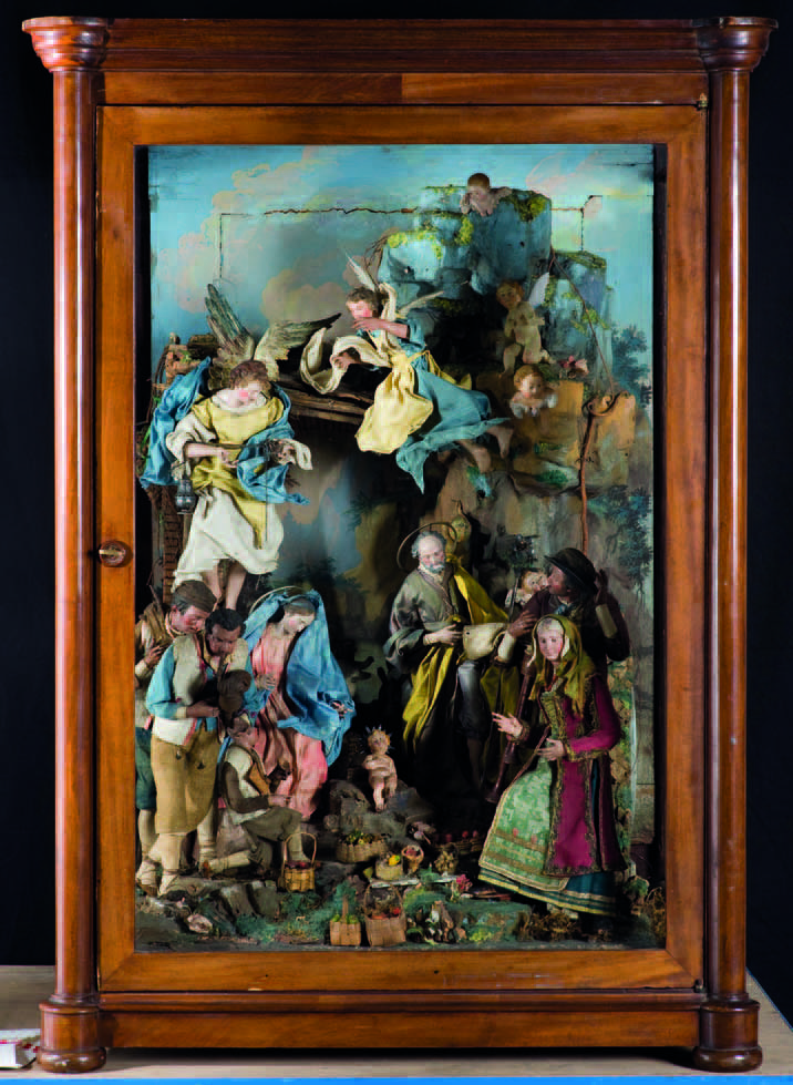 Importante “Adorazione dei pastori”, composizione di figure da presepe napoletane della fine del XVIII secolo, comprendente: - Vergine, con veste rosa e mantello azzurro rivolta verso il basso, opera di Lorenzo Mosca; altezza cm 27 - San Giuseppe, con veste color vinaccia e mantello ruggine con drappo giallo, con volto rivolto verso il basso, opera di Lorenzo Mosca; altezza cm 32 - Gesù Bambino sdraiato - Angelo con veste avorio, manto giallo e svolazzo azzurro, opera di Michele Trillocco; altezza cm 38 - Angelo con veste azzurra, manto giallo e svolazzo avorio, opera di Genzano; altezza cm 30 - Angioletto nudo e tre teste di angioletto - Zampognaro semicalvo, con bocca semiaperta, abbigliato con una giacca in tela beige, pantaloni azzurri e un gilet imitante la pelliccia d’agnello, calzato con ciocie. Accessori: una zampogna e un berretto. Opera di Nicola Somma; altezza cm 37 - Zampognaro soffiante, abbigliato con giacca azzurra, pantaloni in tela beige e un gilet imitante la pelliccia d’agnello, calzato con ciocie. Accessori: una zampogna. Opera di Salvatore Franco; altezza cm 35 - Giovane rustico con giacca e pantaloni in tela marrone e gilet avorio, calzato con ciocie. Accessorio: un flauto. Opera di Michele Trillocco; altezza cm 21 - Contadino in abiti da festa con gilet beige sotto giacca marrone e pantaloni beige. Accessorio: un cappello. Opera di Michele Trillocco; altezza cm 37 - Procidana con corpetto e grembiule in tessuto operato, gonna blu, pastrano rosso e scialle giallo sopra il capo. Opera di Angelo Viva; altezza cm 35 - Asino a figura intera e testa del bue - Accessori: otto cesti con frutta, tre aureole - Scoglio in sughero, legno e cartapesta con fondale dipinto a raffigurare un paesaggio roccioso, XVIII/XIX secolo - Scarabattola in legno e vetro, cm 112x78x64 Bibliografia: “Arte figurativa”, anno IX n. 54, Novembre/Dicembre 1961; copertina Esposizioni: Racconigi, il palazzo, l’inverno. Colori di presepi napoletani in una casa di Re, dicembre 2001 - gennaio 2002; catalogo della mostra, 2001, p. 11. Natività e Nascita. Arte Sacra, cultura e tradizione del territorio biellese Museo del territorio biellese, catalogo della mostra, Chieri, 2003; pp. 108-109; Presepi da Reggia. Opere d’arte da collezioni private dal ‘600 ad oggi. Reggia di Caserta, Cappella Palatina, dal 19/12/2008 al 8/1/2009