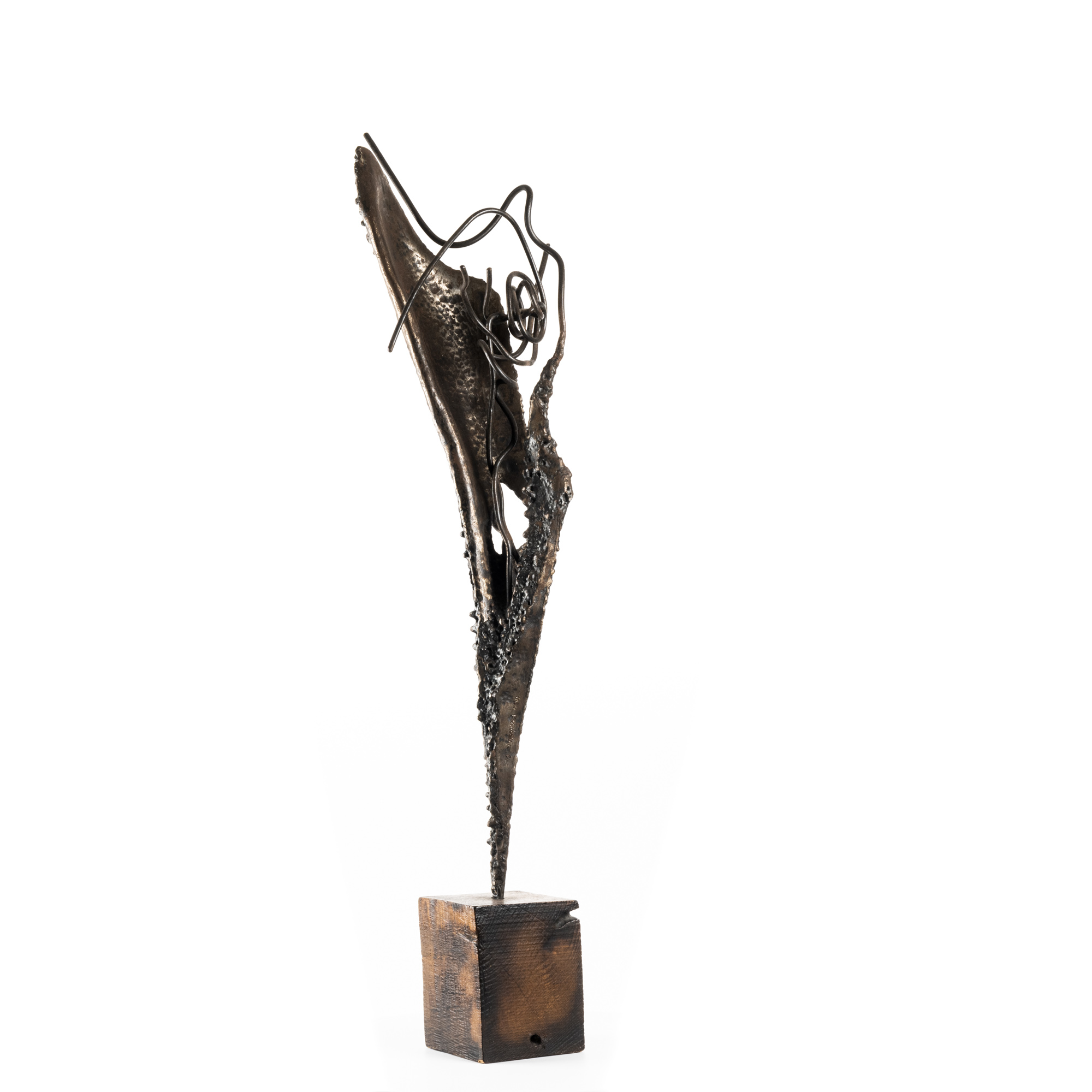 Scultura in ferro su base in legno, h. cm. 85 (di cui base h. cm. 14)