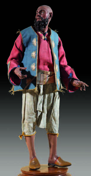 Orientale barbuto e calvo, con camicia in tela rossa e gilet azzurro su pantaloni a righe. Altezza cm 35 Giuseppe Gori, Napoli, fine del XVIII secolo