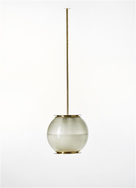 Lampada da sospensione modello "LS4". Produzione Azucena, Milano, 1955. Diffusore in due vetri abbinati e montatura in ottone lucido. (h cm 123) (lievi difetti e piccole mancanze)
