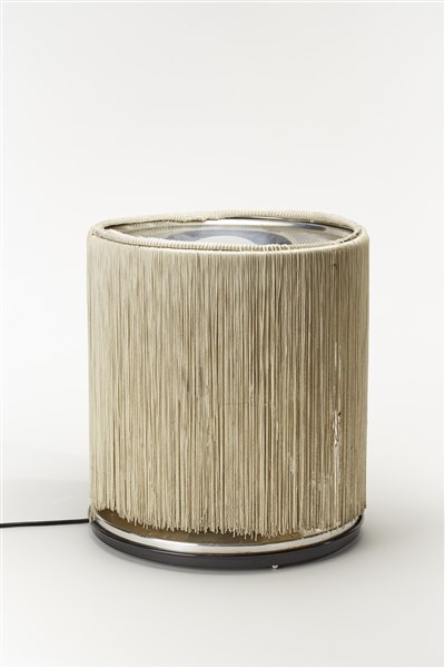 Lampada da tavolo modello "597". Produzione Arteluce, Milano, 1961. Struttura in alluminio e frange in nylon. Recante etichetta del produttore. (h cm 46; d cm 41) (difetti)