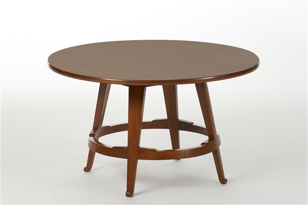 Tavolo basso con piano circolare a quattro gambe intagliate e collegate da anello orizzontale. Italia, 1946. Legno massello. Piano non congruente in legno di teak impiallacciato. (h cm 47; d cm 80) (restauri e sostituzioni)