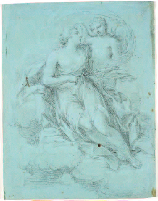 Marcantonio Franceschini Bologna 1648 – 1729 VENERE CORTEGGIATA DA ADONE carboncino nero e grigio su carta azzurra, cm 41,5x32.