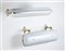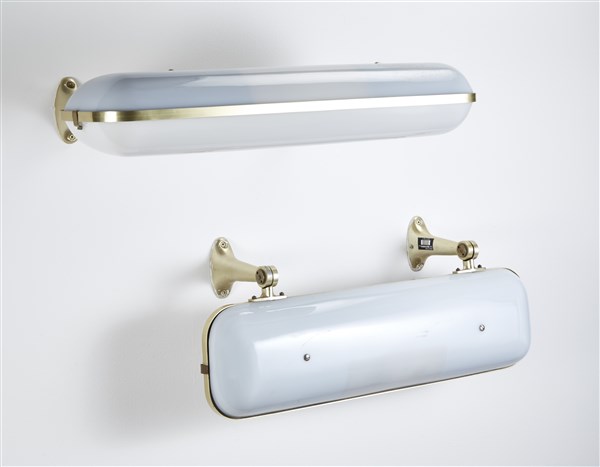 * Coppia di lampade da parete. Milano, 1957. Struttura in fusione di alluminio ottonato, diffusore in metacrilato bianco opaco. (l cm 73) (lievi difetti)