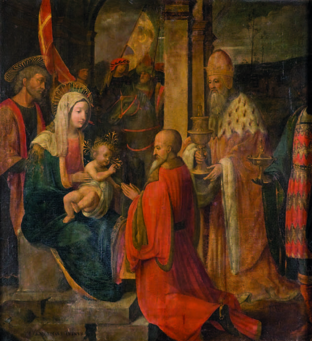 Bernardino Luini (seguace) ADORAZIONE DEI MAGI olio su tela, cm 75,5x68.