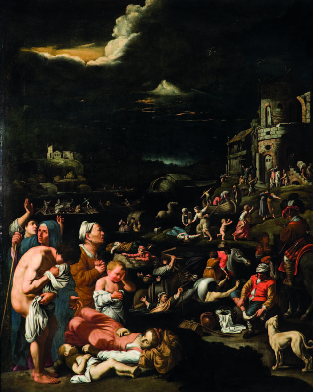 Carlo Saraceni Venezia 1579 – 1620 IL DILUVIO UNIVERSALE olio su tela, cm 122x98 Esposizioni: Monte Santa Maria Tiberina, Palazzo Museo Bourbon del Monte, I bari a confronto. Il giovane Caravaggio nella casa del cardinale Francesco Maria del Monte, 29 settembre – 7 ottobre 2012, n. 6; Bibliografia: P. Carofano (a cura di), I bari a confronto. Il giovane Caravaggio nella casa del cardinale Francesco Maria del Monte, Bandecchi & Vivaldi Editore e stampatori 2012, n. 6 p. 44 (cit.), p. 45 (ill.). L’opera, recentemente esposta presso la mostra I bari a confronto. Il giovane Caravaggio nella casa del cardinale Francesco Maria del Monte, curata dal Professor Pierluigi Carofano, testimonia l’impronta naturalista di matrice caravaggesca del pittore veneziano. Il soggetto è stato affrontato dall’artista in più occasioni, a partire dalla versione conservata a Pommersfelden, presso la Galleria di Schönborn, riferita a Carlo Saraceni da Roberto Longhi (cfr. R. Longhi, Un ignoto corrispondente del Lanzi sulla Galleria di Pommersfelden, in “Paragone”, III, 1950). Successivamente, in occasione della monografia dedicata al pittore, la Professoressa Anna Ottani Cavina suggeriva un riferimento anche ad Agostino Tassi in merito ai toni drammatici del paesaggio (cfr. A. Ottani Cavina, Carlo Saraceni, Mario Spagnol, Milano 1968, n. 50, p. 111). Un’altra versione di buona qualità è testimoniata da un’asta di Piasa (olio su tela, cm 115x96; Parigi, 6/12/2009, lotto n. 11), mentre altre versioni meno convincenti, da ritenersi delle copie, si annoverano presso la Galleria Manzoni di Milano (olio su tela, cm 118x93; cfr. Ottani Cavina, op. cit., n. 139), e in occasione di una vendita a Parigi (Hotel Drouot, Ader Picard Tajan Masters, 13/06/1986, n. 174). Per l’opera è stato avviato il procedimento di dichiarazione d’interesse storico artistico, a seguito del diniego all’esportazione emesso dalla Soprintendenza di Verona, ai sensi dell’art. 13 Dlgs. 42/2004.
